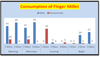 Information related to frequency and quantity of finger millet consumption is available for 100 sample households. All households had reported having consumed finger millet last year. Around 90 percent of them consumed it on a daily basis. Around 10 percent of households consumed it occasionally. To understand the time and quantity of consumption of the sample households, the quantity was taken in terms of the number of glasses, and the time was taken in the morning, afternoon, evening, and night.