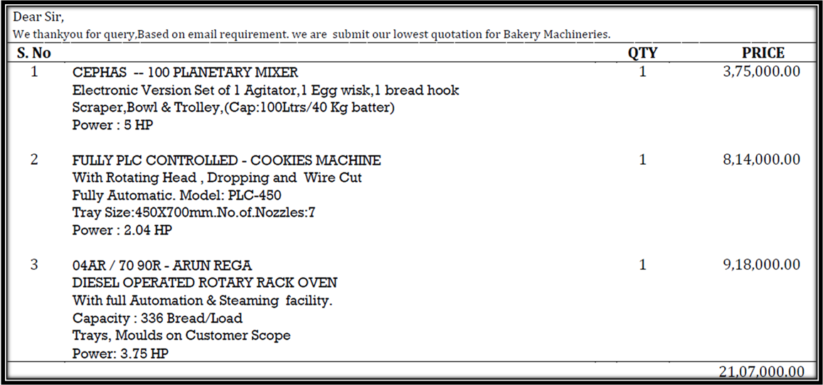 Going deep into the project, enquired about the cost of the machines from ARUN REGA BAKERY MACHINERIES PVT. LTD., Hyderabad. I have specified the model of machines and got the quotation.