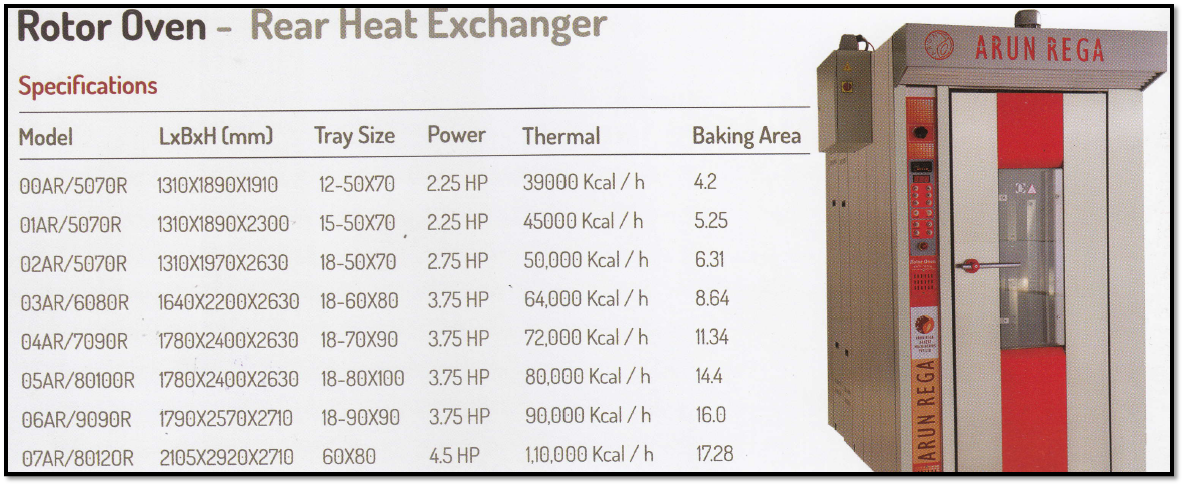 Rotary Oven is an advanced technology over convection oven. In the convection oven, the warm air is not equally distributed. In a rotary oven, the trays are rotated and it uses a built-in fan that forces the heated air faster inside the oven through the cavity and circulates it around the item being cooked. Therefore, a rotary oven cooks much faster than the convection oven and also cooks food at lower temperatures. The rotary oven consists of: – A cabin with racks -Trays -Oven cavity -Starter with temperature indicator