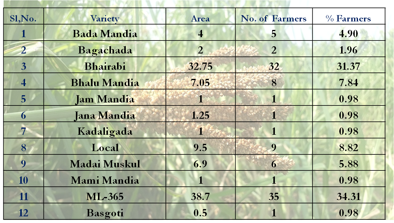 The Finger Millet is mostly grown by the tribal farmers of Koraput as it can withstand drought and can be grown in marginal and infertile soil. Finger Millet serves as an important food for nutritional security as it is rich in nutrients and easy to process as compared to other millets. The best attribute of Finger Millet is that it has excellent keeping qualities. The varietal diversity in Finger Millet is considered to be an important contributor to the resilience of the concerned farming system.
